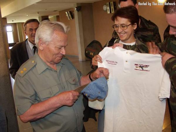 Mr. Kalashnikov was given one of our Staff Polo Shirts that had HONORARY GUNS NETWORK LLC STAFF and underneath had MIKHAIL KALASHNIKOV embroidered.  This was made possible on behalf  of the owners AK-47.net and the community of Guns Network LLC.